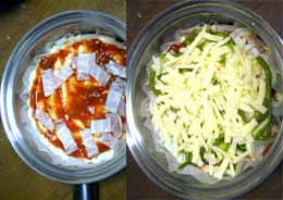 切り終わったら生地の上にパスタソース(またはケチャップ)をぬり、切った材料をトッピングして最後にとろけるチーズを乗せます。
